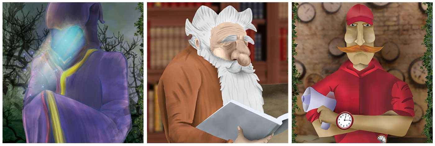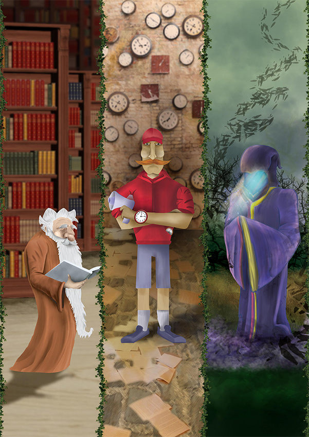 After making her way through the labyrinth, Vanda encounters the three Time Lords. The Past Lord, a slow-paced old man who lives in an immense library with all the books ever written by mankind. The Present Lord, who is always running this way and that, counting every passing second on his various clocks scattered throughout his realm. And Mister Future, a mysterious being whose face is never revealed, but he emanates a light that gets brighter if Vanda is closer to the correct answer or gets darker if she is further away.